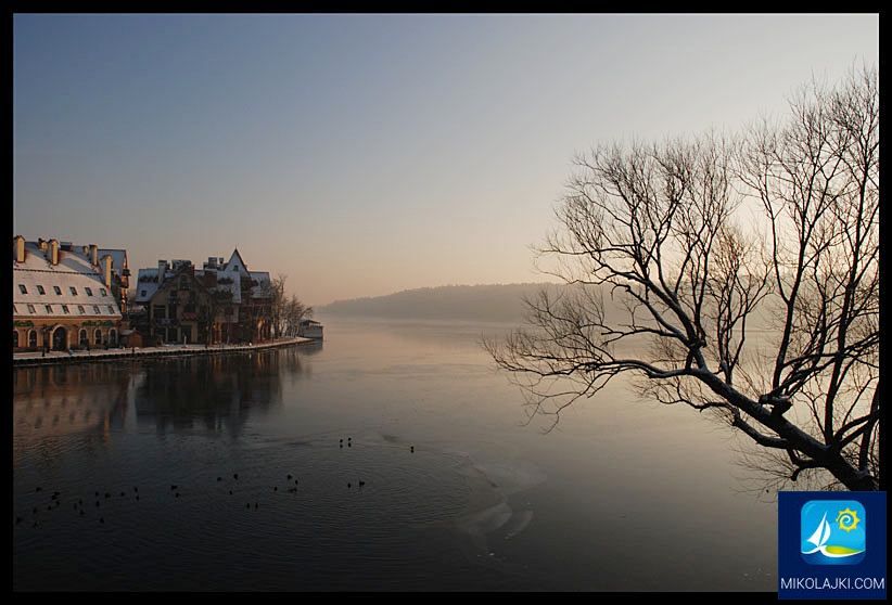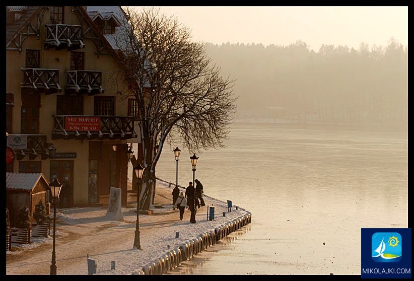 Zimowy poranek w Mikołajkach - Piękny zimowy widok na Mikołajki z brzegiem jeziora i delikatnym światłem poranka.