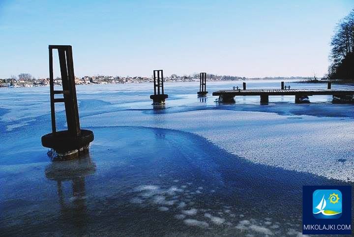 Zamarznięty pomost w Mikołajkach - Zimowa sceneria z zamarzniętym pomostem na jeziorze w Mikołajkach, popularnym mazurskim miasteczku.